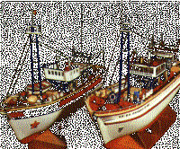 Miniaturas de Embarcações - Produto da saudade dos pescadores, que retirados da faina pela idade ou impedidos pelo mau tempo, exercitam a memória na reprodução em miniatura de embarcações com que venceram o mar e ganharam o magro pão de cada dia.